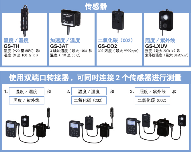 GL100日本圖技溫濕度/多功能數(shù)據(jù)記錄儀可以采集溫度、濕度、電壓、電流、照度、紫外強(qiáng)度、二氧化碳等多種信號(hào)器。使用雙端口轉(zhuǎn)換器,可同進(jìn)連接2個(gè)傳感器進(jìn)行測(cè)量。