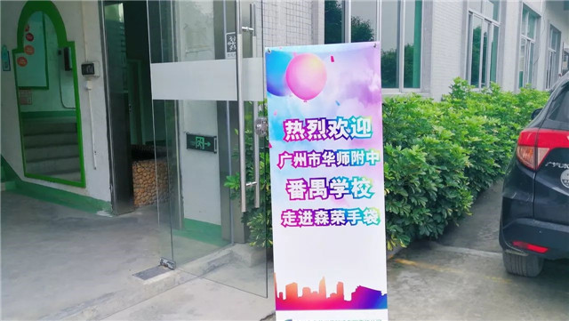 鏡頭轉向森榮辦公大樓,一張光彩奪目的海報赫然映入眼簾:熱烈歡迎廣州市華師附中番禺學校走進森榮手袋。